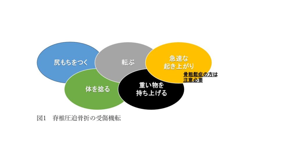 脊椎圧迫骨折とは、主に骨粗鬆症の高齢者が、尻もちや転倒、あるいは前かがみ動作など軽微な負荷で背骨(椎体)が押しつぶされる骨折です。(図1)しかし、転んでいないのに折れているという経験をされる方もいると思います。