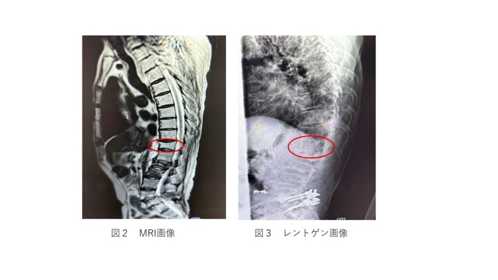図2はMRI画像であり、第1,2腰椎の椎体圧迫骨折です。図3も同様の箇所です。椎体の前方がつぶれ、脊柱管にも影響を及ぼしています。そのため腰痛以外にも脚の痺れる、筋力低下を引き起こすといった症状もみられます。