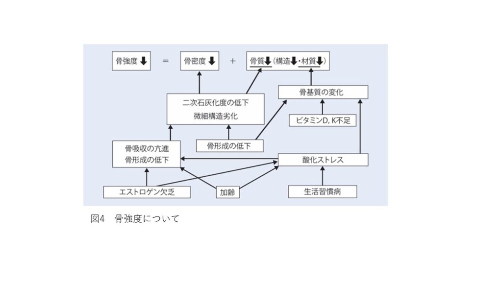 骨粗鬆症は骨強度が下がることで骨折リスクが増大します。骨強度とは、骨密度と骨質の2つの要因からなり、骨密度は骨強度のほぼ70%、残りの30%は骨質からなります。骨質は、微細構造、骨代謝回転、微小骨折、骨組織の石灰化度などのことです。